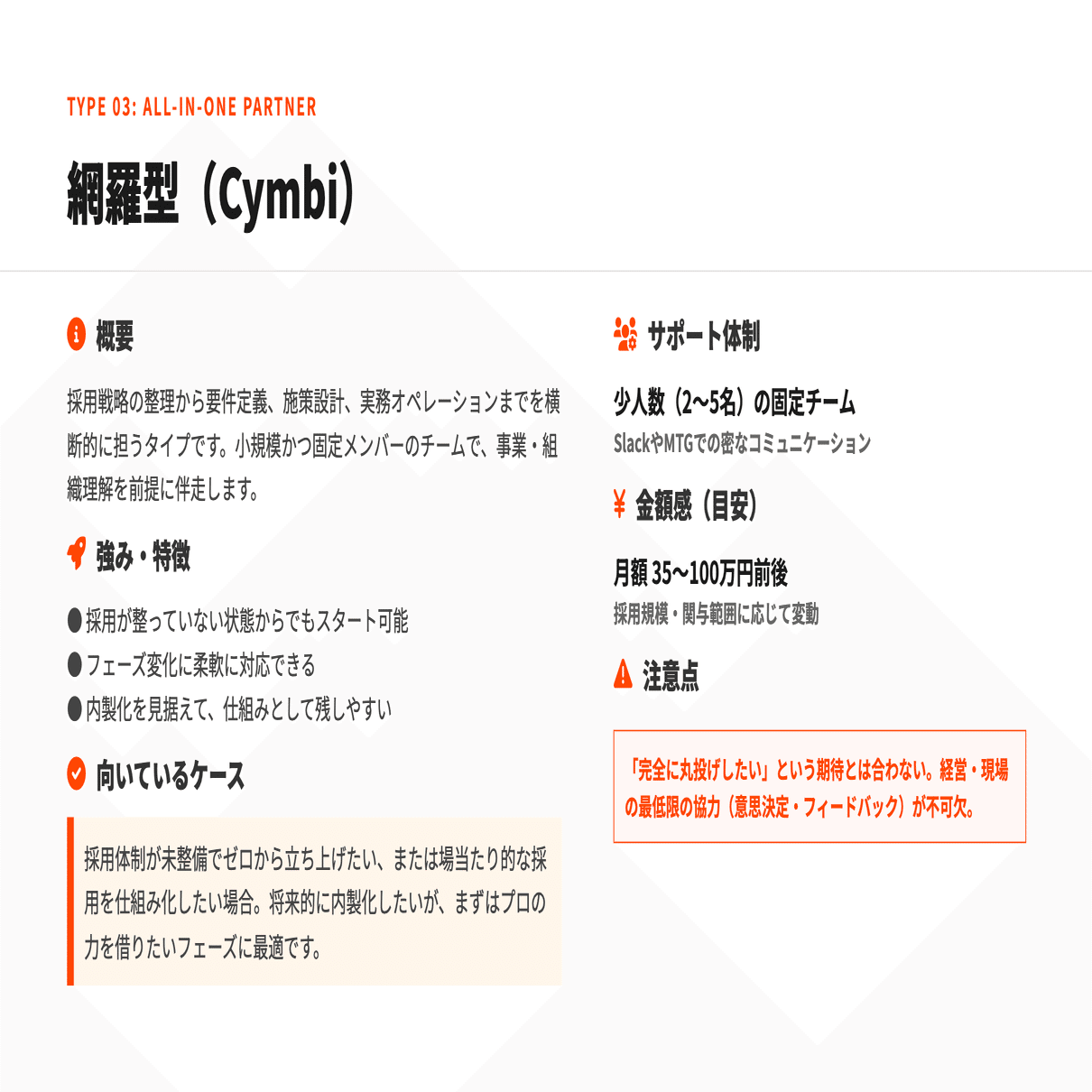 Cymbi(シンビ)は、これらのタイプの中でも「採用の立ち上げ〜安定運用〜内製化」を一貫して支援する網羅型のパートナーです。