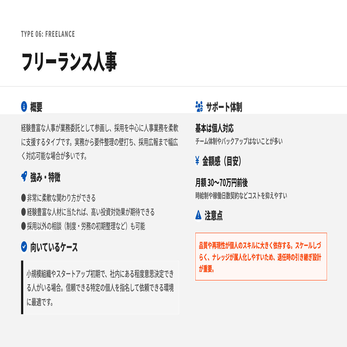 主な外部パートナーのタイプを「何をしてくれるか」「強み」「向いているケース」「注意点」という観点で整理しています。
