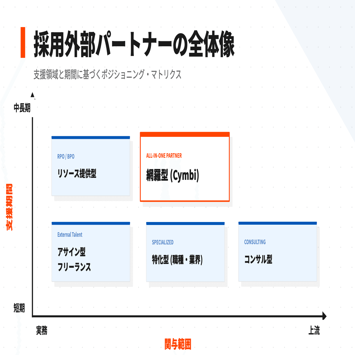 「関与範囲(上流〜実務)」と「支援期間(短期〜中長期)」の2軸で外部パートナーの位置づけを整理したものです。